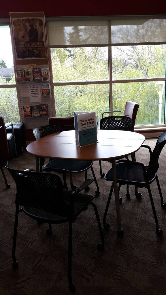 这是馆中专门为TEEN设置的 TEEN‘s ZONE。TEEN在北美特指13至19年龄段的孩子,因为每个数字都以TEEN结束。桌上的牌子提醒读者这里是专供TEEN阅读的区域。