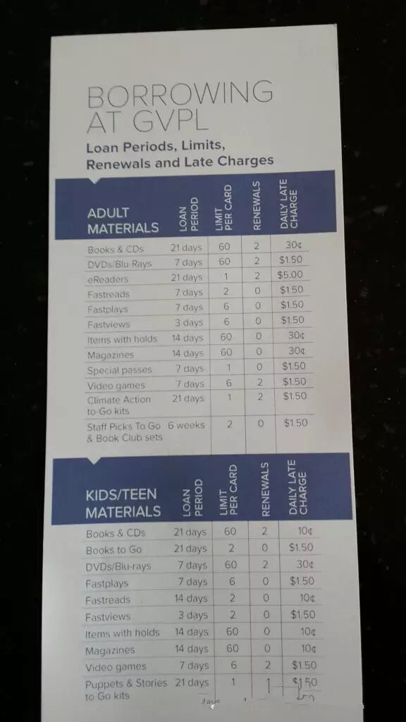 图书卡即开即用, 每张成人卡可以借60本书和CD, 借期21天;60张DVD,借期7天;60本杂志,借期14天。书和DVD到期之前可以续借两次。还有其他项目不一一列举。孩子卡和成人卡册数,借期一致,只是逾期罚款低一些,例如成人卡借书逾期一天罚30分,孩子卡只罚10分。