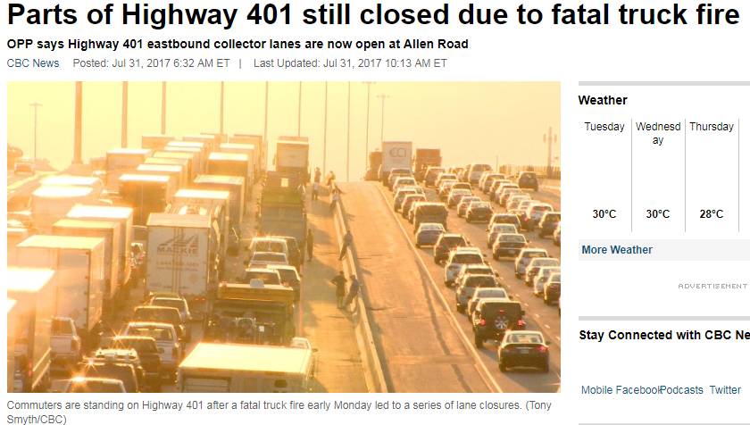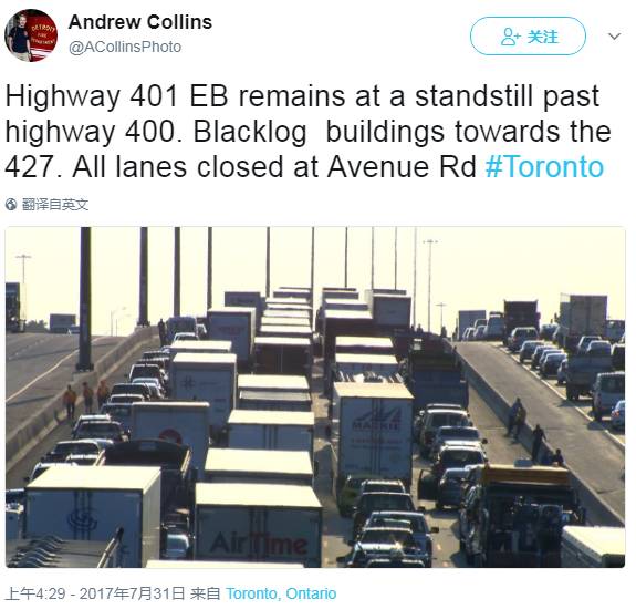 今天我们的西洋镜就和大家介绍下这条401,多伦多的大动脉,每当周末或者通勤高峰期,它就会动脉硬化一下子。不信,那我们就一起来看看本周一,7月31日,这401到底出了什么幺蛾子…