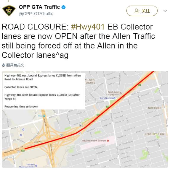 位于Allen Road的所有东向快速车道和连接车道都被关闭,靠近Yonge Street位置的所有快速车道也都被关闭,401东向慢车道已经重新开放。