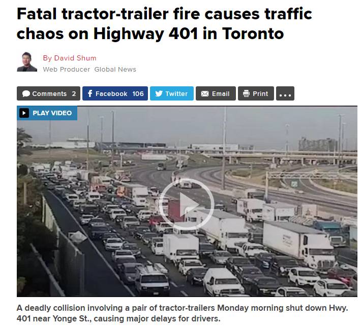 据急救人员说,两辆卡车相撞,其中一辆是运输大卡车,地点是401的Avenue Road附近。