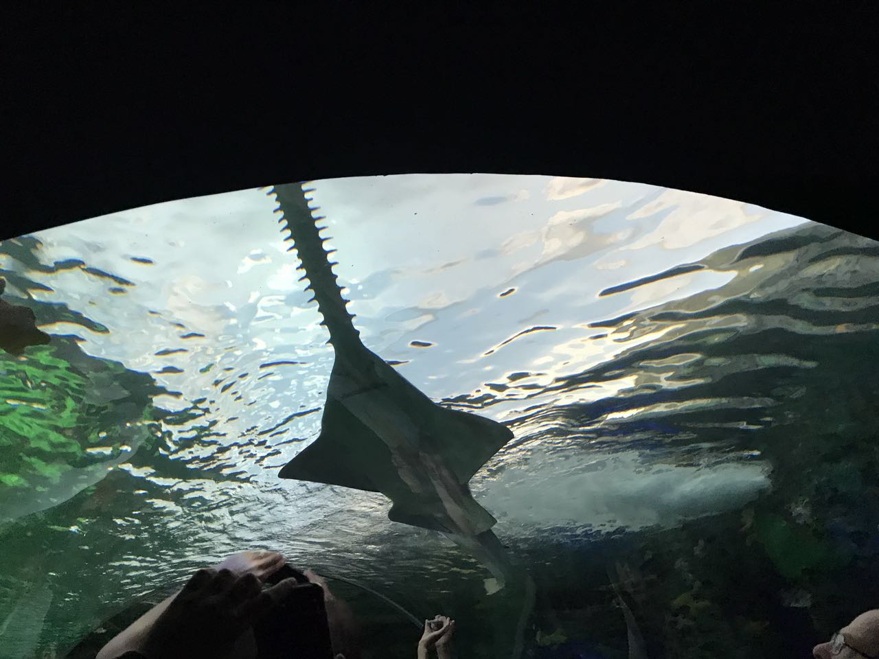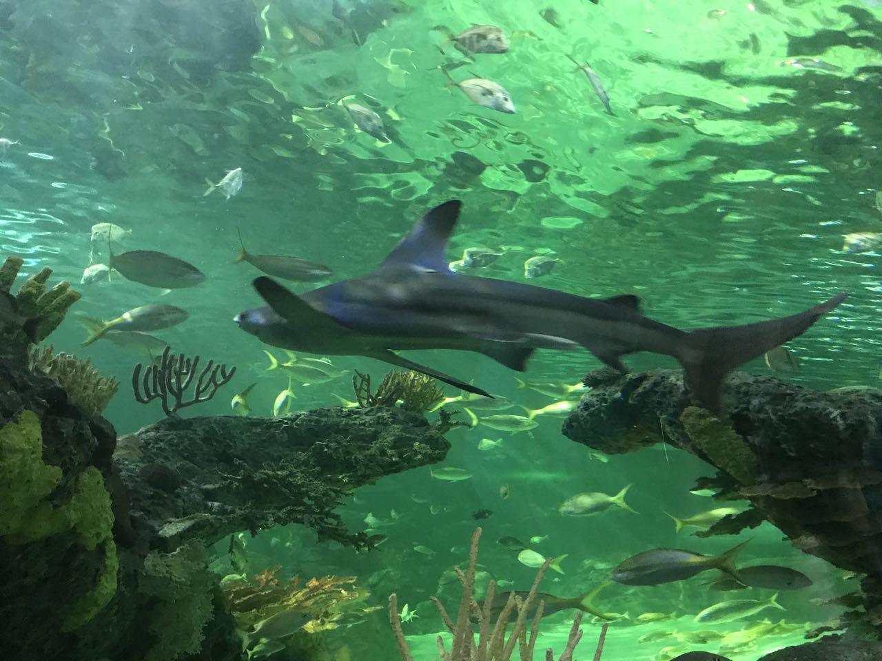 于是我们一家走进了这条长96米的移动玻璃隧道,体验了一下行走于海底世界的感觉,头顶上是虎视眈眈的沙虎鲨、沙洲鲨等各种鲨鱼,周围围绕着各式小鱼,贴近玻璃,没准还有好奇的鱼儿们向你游来。