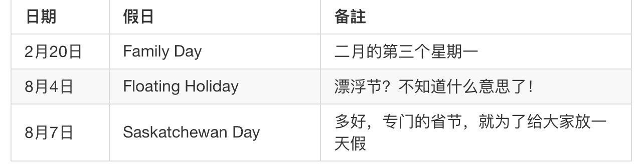 看完全国性的假日,来看一下咱们萨省还放哪些假吧!